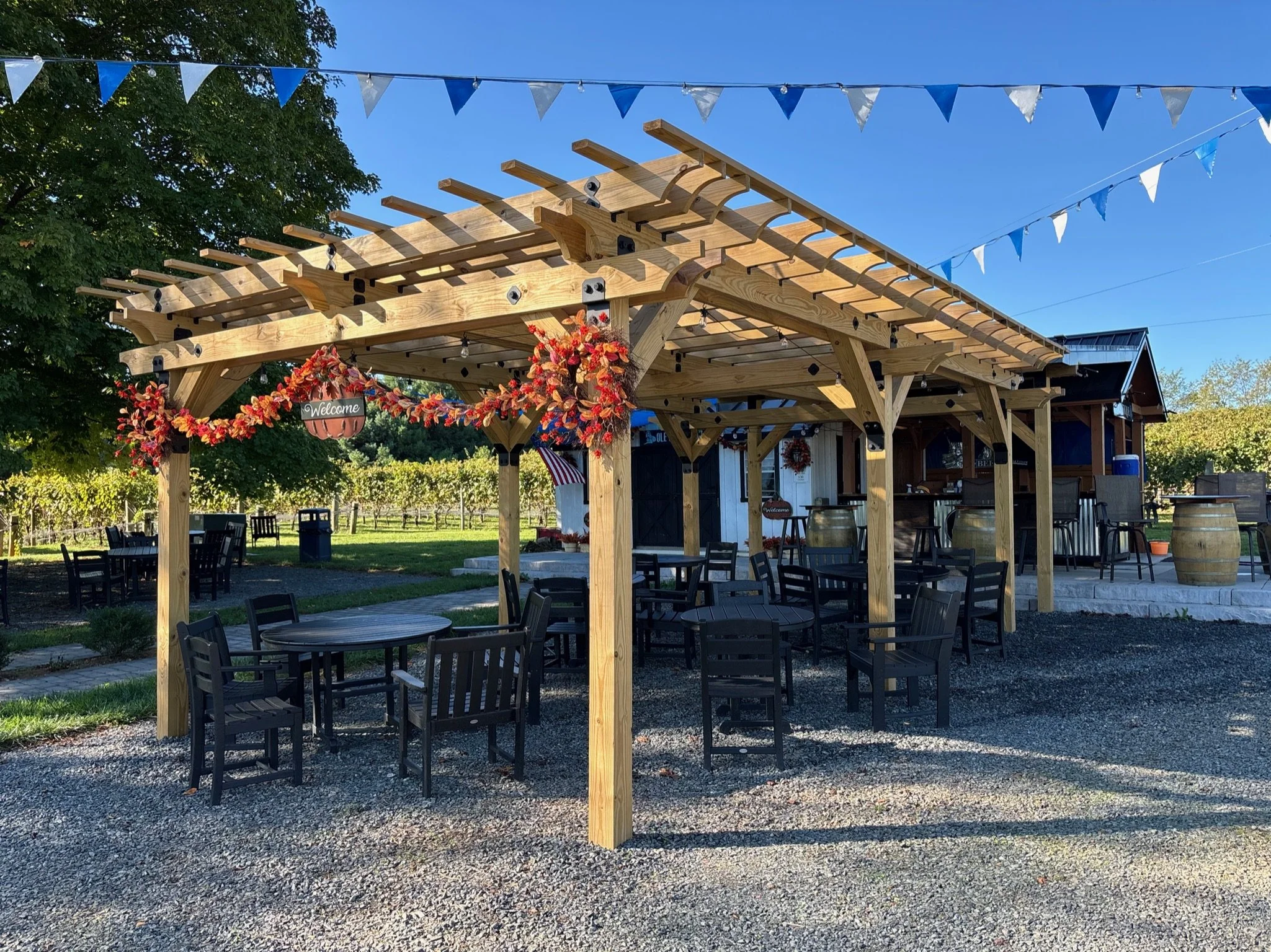 Up to 20 guests | Sat - Sun | 11am - 5pm The Party Pergola is a great place for informal smaller gatherings for up to 20 guests to drink wine, cater food, and be together. It’s situated right next to our outdoor bar for convenient service and parking. The rental includes the private use of the space for 4 hours, tables, and seating. It is family and pet-friendly, and you may bring your own decor (just no staples and tape). Available April - November.